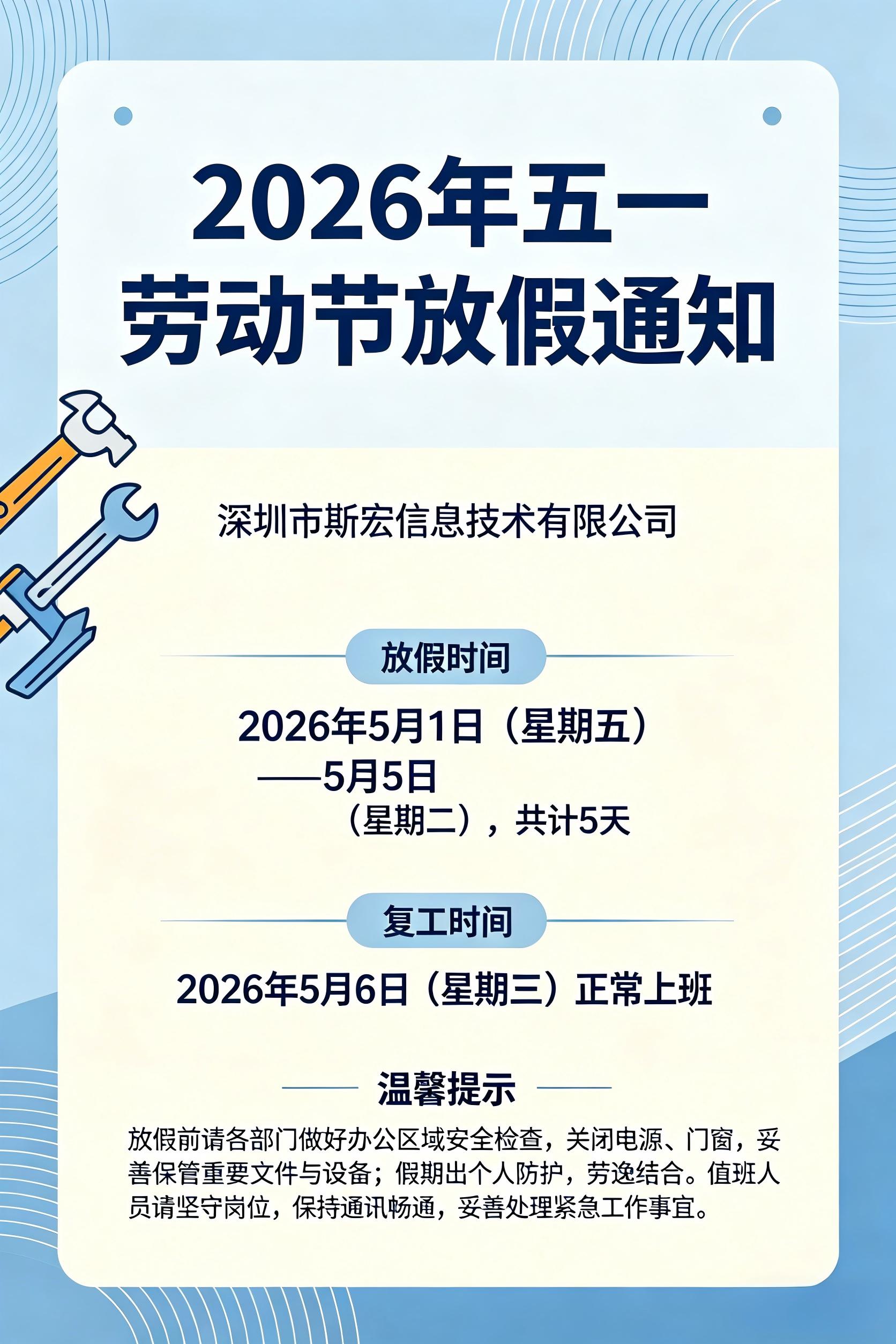 作者:斯宏信息 | 发布时间:2026-05-01尊敬的新老客户、合作伙伴及广大用户:您好!感谢大家长久以来对我司的信任与支持。结合国家法定节假日安排及公司运营规划,为合理调配工作节奏,现将我司